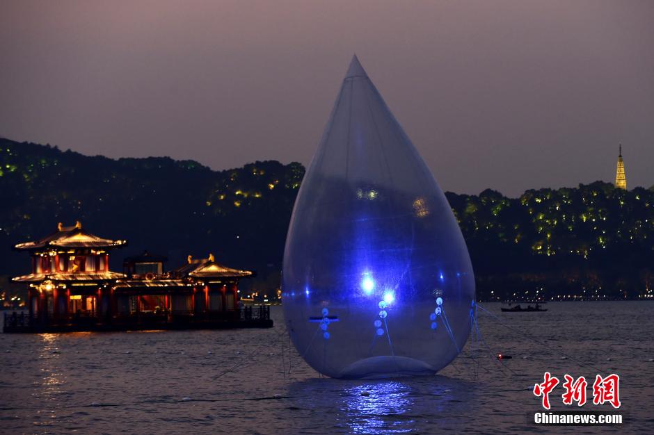A one-week "Dancing Water Drops 2014" Art Exhibition kicks off in West Lake of Hangzhou, southeast China’s Zhejiang Province, Oct. 18, 2014. The whole group of works consists of five water drop models 12 to 20 meter in height floating on the lake and hundreds of small "water drops" placed on the park lawn, meaning "look at the world through water drops", to advocate the ecological concept of "protect water, love water, and cherish every drop of water". (CNSPHOTO/Li Zhong)