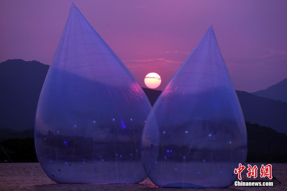 A one-week "Dancing Water Drops 2014" Art Exhibition kicks off in West Lake of Hangzhou, southeast China’s Zhejiang Province, Oct. 18, 2014. The whole group of works consists of five water drop models 12 to 20 meter in height floating on the lake and hundreds of small "water drops" placed on the park lawn, meaning "look at the world through water drops", to advocate the ecological concept of "protect water, love water, and cherish every drop of water". (CNSPHOTO/Li Zhong) |