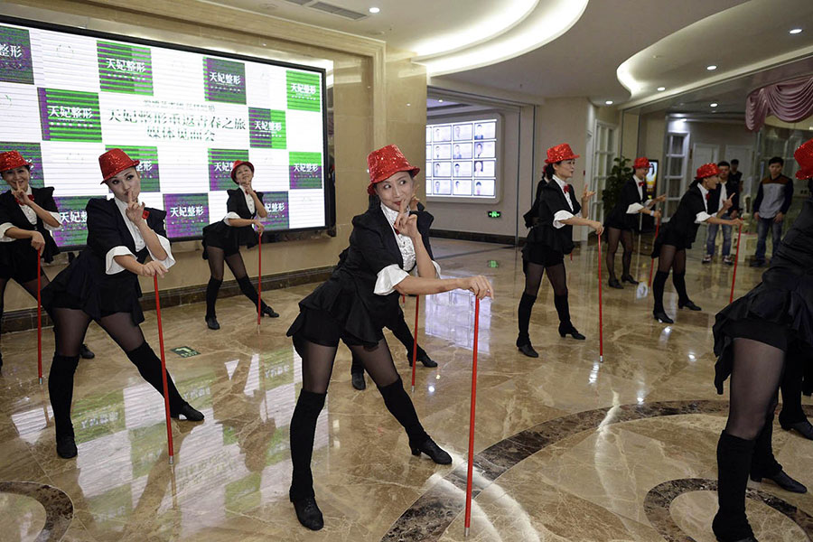 Several grannies in silk stockings and leotards gathered in a hospital for cosmetic surgery in southwest China's Chongqing on Oct. 15, 2014.