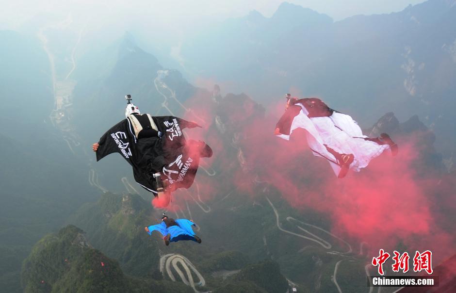 Competitors spread their wings over Tianmen Mountain in Zhangjiajie, Hunan province, during the third World Wingsuit Championship, Oct. 19, 2014. (CNS/Yang Huafeng)