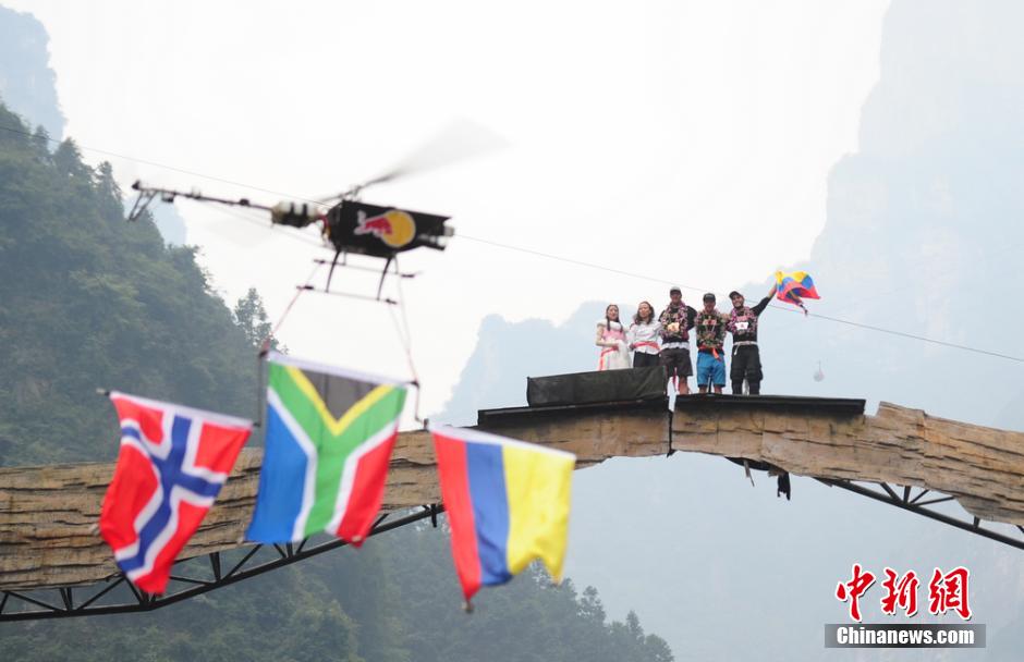 The 3rd World Wingsuit Championship was held in Zhangjiajie, central China's Hunan province on Oct. 19, 2014. South African Julian Boulle, won the championship with 33.25 seconds after completing an obstacle course on Tianmen Mountain, a tourist attraction in Zhangjiajie city.(CNS/Yang Huafeng) |