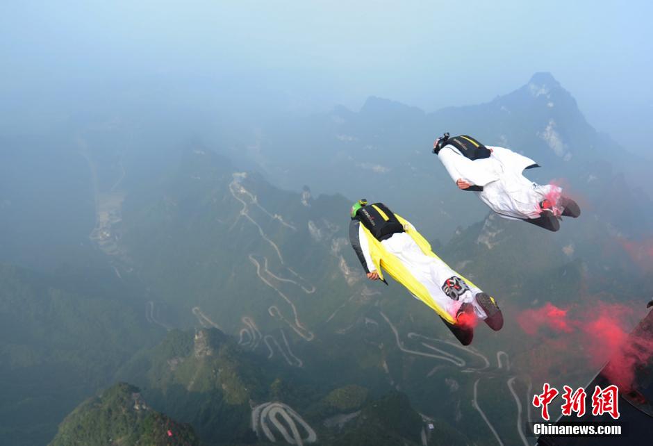 Competitors spread their wings over Tianmen Mountain in Zhangjiajie, Hunan province, during the third World Wingsuit Championship, Oct. 19, 2014. (CNS/Yang Huafeng)