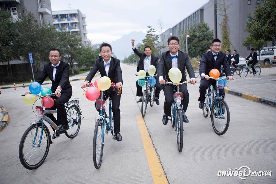 Grooms set off from the building of doctoral studies to pick up their brides by bikes. (Photo/Cnwest)