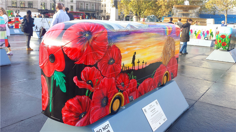 LONDON Oct. 21, People's Daily Online -- Twenty-eight New Routemaster bus sculptures were unveiled for the first time today in Trafalgar Square. These sculptures forms a collection of 60 bus sculptures, commissioned by Transport for London (TfL), which will be placed across London on four walking trails as part of the Year of the Bus Sculpture Trail. The first three trails will be installed for the public to enjoy from Monday 20 October with a fourth following for Christmas.