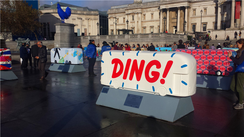 LONDON Oct. 21, People's Daily Online -- Twenty-eight New Routemaster bus sculptures were unveiled for the first time today in Trafalgar Square. These sculptures forms a collection of 60 bus sculptures, commissioned by Transport for London (TfL), which will be placed across London on four walking trails as part of the Year of the Bus Sculpture Trail. The first three trails will be installed for the public to enjoy from Monday 20 October with a fourth following for Christmas.