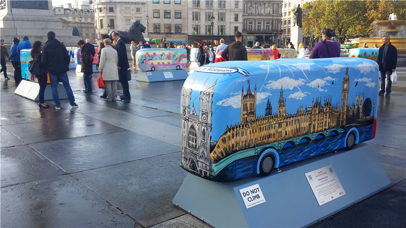 LONDON Oct. 21, People's Daily Online -- Twenty-eight New Routemaster bus sculptures were unveiled for the first time today in Trafalgar Square. These sculptures forms a collection of 60 bus sculptures, commissioned by Transport for London (TfL), which will be placed across London on four walking trails as part of the Year of the Bus Sculpture Trail. The first three trails will be installed for the public to enjoy from Monday 20 October with a fourth following for Christmas.
