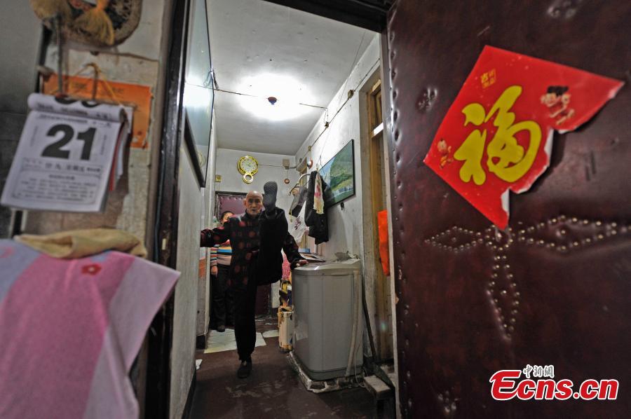 Zhang Chenglin, a 96-year-old man from Taiyuan is still able to do the splits and can stretch his leg to rest on the top of his refrigerator. Zhang said he exercised every day by walking 1,000 steps. [Photo: China News Service/ Wu Junjie]