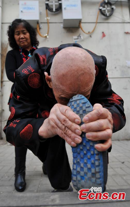 Zhang Chenglin, a 96-year-old man does a split during his morning exercise in a residential community in Taiyuan, Shanxi province on Tuesday, October 21, 2014. Zhang said he exercised every day by walking 1,000 steps. [Photo: China News Service/ Wu Junjie] |