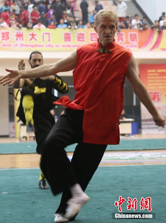 Competitor shows kung fu during the 10th Intl' Shaolin Wushu Festival in Dengfeng, central China's Henan province, Oct. 20, 2014. Nearly 2000 kung fu masters from 63 countries participated in the festival. (CNS/Yang Zhenghua)