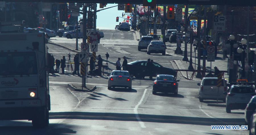 A street blanked off by policemen is seen near the Canadian parliament building in Ottawa, Canada, on Oct. 22, 2014. A Canadian soldier standing guard at the National War Memorial in Ottawa was gunned down and a security guard in the nearby parliament buildings wounded on Wednesday in an attack that police believe involved more than one gunman. (Xinhua/Li Baodong) |