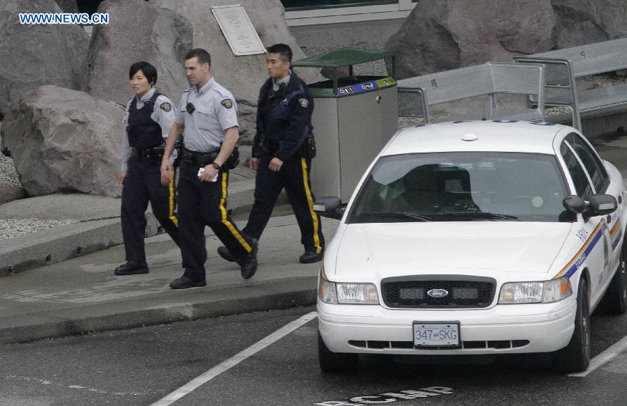 Policemen patrol around the building of the Vancouver International Airport in Vancouver, Canada, Oct. 22, 2014. After the shooting at the National War Memorial and Parliament Hill in Ottawa on Wednesday, Provinces across Canada stepped up the security measures including airports have been heightened their security levels in response to the terrorist attack.(Xinhua/Liang Sen) |