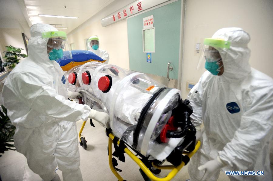 Medical workers take part in a drill to deal with Ebola cases at the Guangzhou Eighth People's Hospital in Guangzhou, capital of south China's Guangdong Province, Oct. 23, 2014. Guangdong has ruled out possible Ebola cases as 43 people suspected of infection tested negative for the deadly virus. A total of 8,672 people from Ebola-ridden areas entered the province since August 23, and so far, 5,437 people have been discharged from medical observation. (Xinhua/Liu Dawei) |