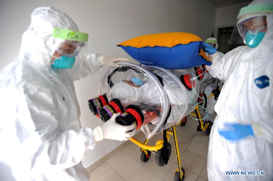 Medical workers take part in a drill to deal with Ebola cases at the Guangzhou Eighth People's Hospital in Guangzhou, capital of south China's Guangdong Province, Oct. 23, 2014. Guangdong has ruled out possible Ebola cases as 43 people suspected of infection tested negative for the deadly virus. A total of 8,672 people from Ebola-ridden areas entered the province since August 23, and so far, 5,437 people have been discharged from medical observation. (Xinhua/Liu Dawei) |