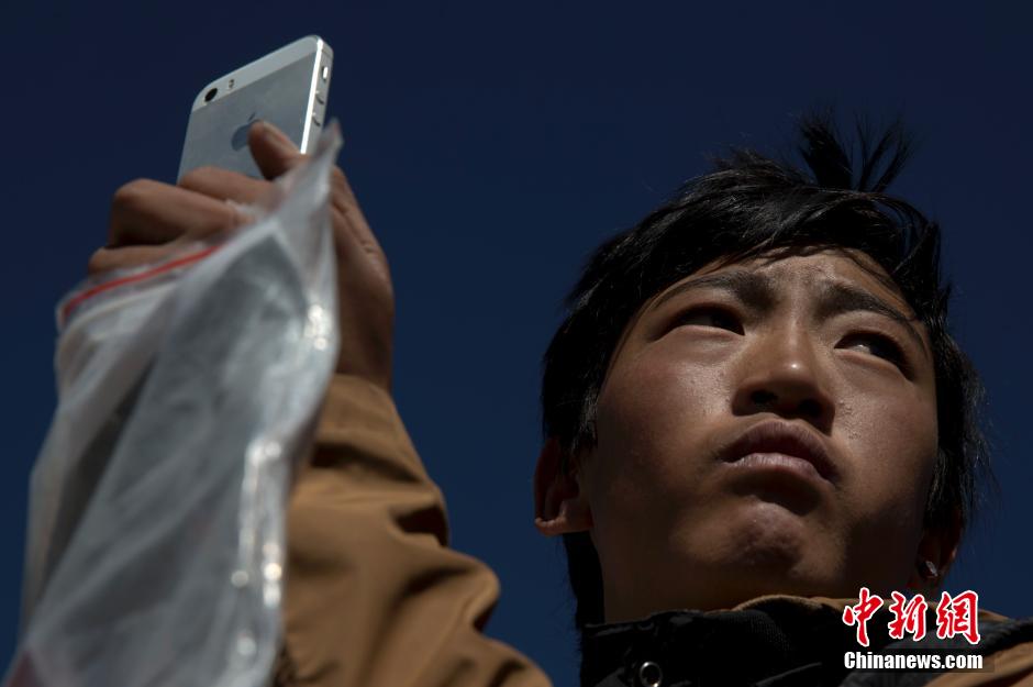 18-year-old Laba takes photos with his mobile phone in Naqu County, southwest China's Tibet Autonomous Region, Sept. 28, 2014. (Chinanews.com/Liu Guanguan)