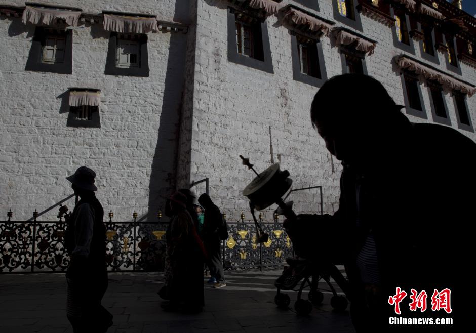 Two Tibetans turn the prayer wheels around the Jokhang Temple in Lhasa, capital of southwest China's Tibet Autonomous Region, Sept. 29, 2014. (Chinanews.com/Liu Guanguan)