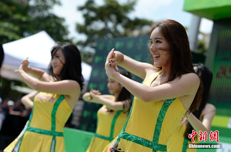 The first stage of 2014 Tour of Hainan kicks off in Chengmai, south China's Hainan province on Oct.20, 2014. Cheerleaders in bright-color clothes dancing to music were quite attractive before the match. (CNS/Luo Yunfei)