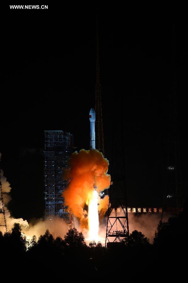 An unmanned spacecraft is launched atop an advanced Long March-3C rocket from the Xichang Satellite Launch Center in southwest China's Sichuan Province, Oct. 24, 2014. China launched the lunar orbiter early Friday to test technologies to be used in the Chang'e-5, a future probe that will conduct the country's first moon mission with a return to Earth. (Xinhua/Jiang Hongjing) |