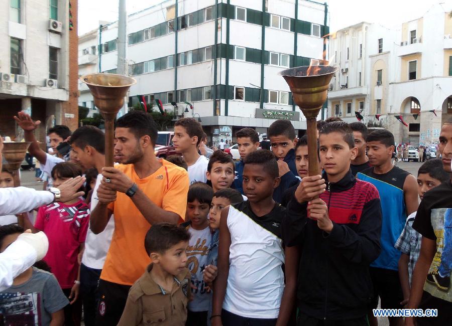 Libyans attend a ceremony to mark the third anniversary of the declaration of the liberation from former leader Gaddafi, at the Martyrs' Square in Tripoli, capital of Libya, on Oct. 23, 2014. (Xinhua/Hamza Turkia)