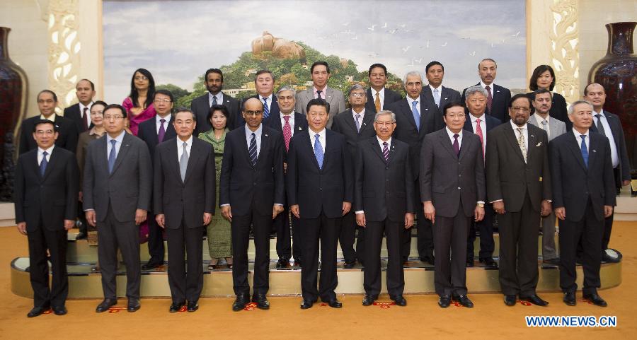 Chinese President Xi Jinping (C, front) poses for a group photo with representatives of 21 Asian countries who signed the Memorandum of Understanding on Establishing Asian Infrastructure Investment Bank (AIIB) in Beijing, capital of China, Oct. 24, 2014. (Xinhua/Huang Jingwen) |