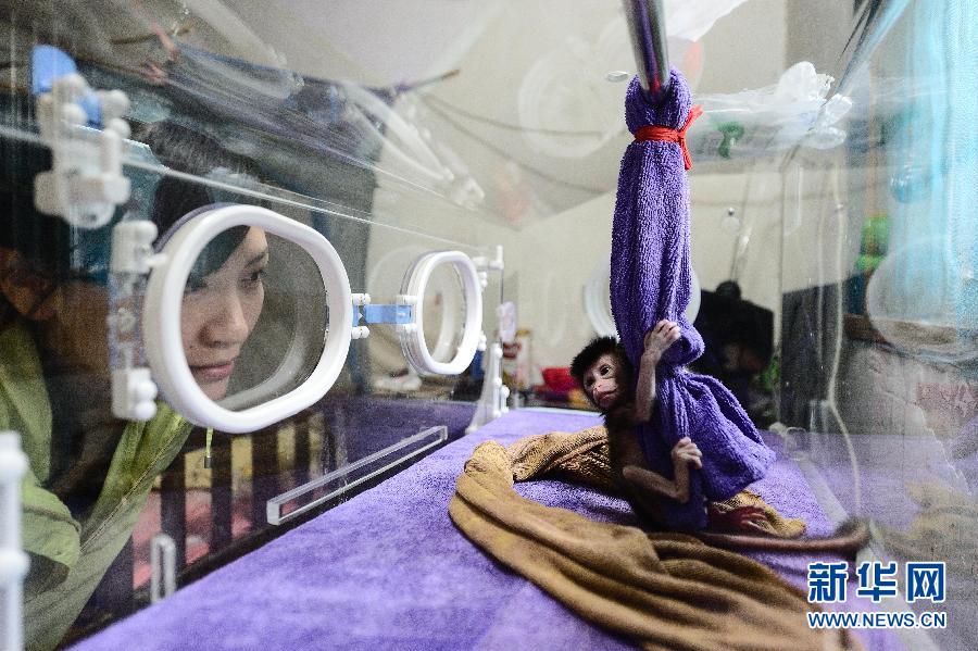 Chen Rong takes care of newly born newly born rhesus macaques - Sept. 17, 2014. (Xinhua/Liu Jinhai)