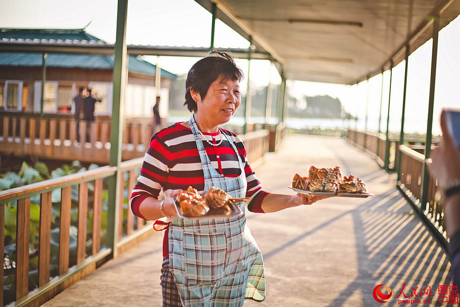 Photo shows the harvest of the hairy crabs in Yangcheng Lake in Jiangsu province. (People's Daily Online/Wang Chu)