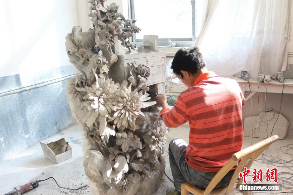 Chrysanthemum stone is formed in geological conformation movement. A gold medal winner in 1915 Panama World Expo, the chrysanthemum stone of Liuyang, central China’s Hunan Province enjoys great fame. As unique artwork of Liuyang, the chrysanthemum stone carving is famous for its sophisticated craftsmanship and high collection value. (Chinanews/Huang Shili)