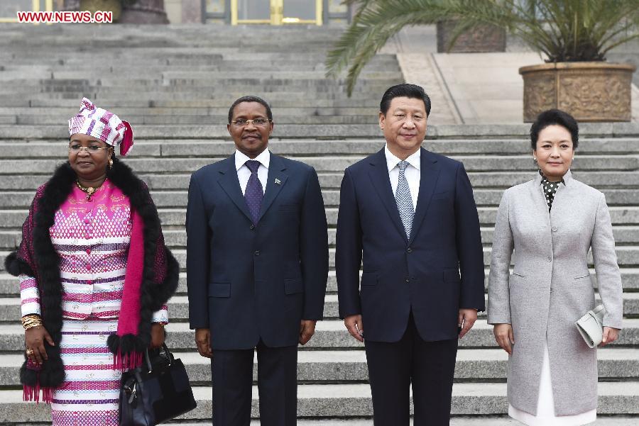 Chinese President Xi Jinping (2nd R), his wife Peng Liyuan (1st R), Tanzanian President Jakaya Mrisho Kikwete (2nd L) and his wife (1st L) pose for a group photo during a welcoming ceremony held for the visiting Tanzanian president in Beijing, capital of China, Oct. 24, 2014. (Xinhua/Li Xueren) |
