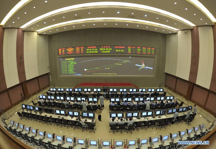 Technicians wait for the first adjustment of the test orbiter for lunar mission at the Beijing Aerospace Control Center, in Beijing, China, Oct. 24, 2014. The test orbiter made its first adjustment successfully at 4: 29 p.m. on Friday under technicians' accurate control. (Xinhua/Tian Zhaoyun) |