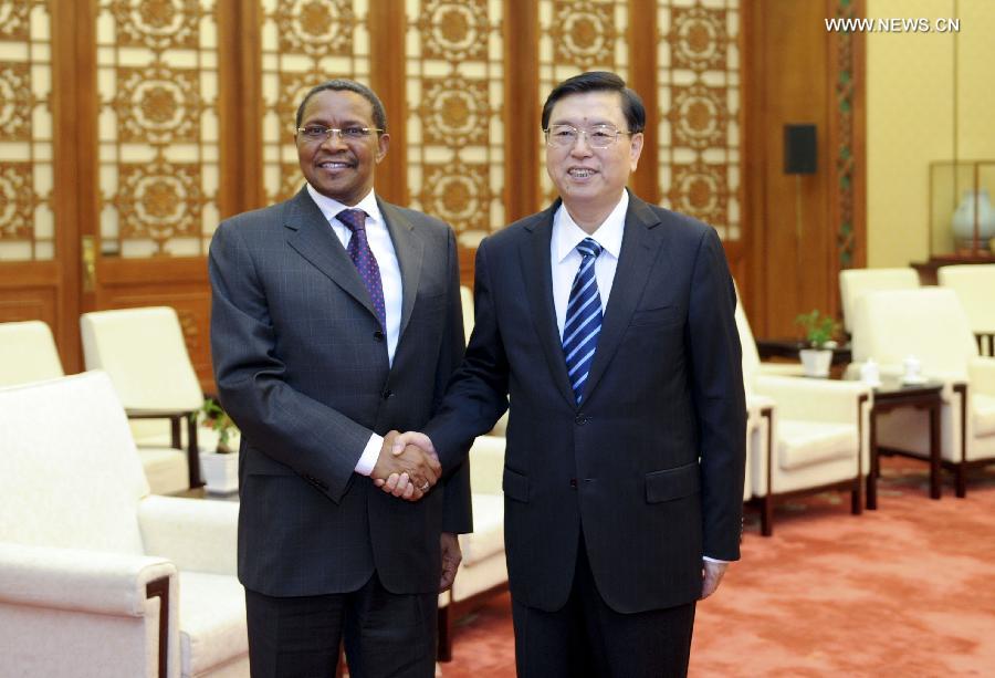 Zhang Dejiang (R), chairman of the Standing Committee of China's National People's Congress, meets with Tanzanian President Jakaya Mrisho Kikwete in Beijing, capital of China, Oct. 24, 2014. (Xinhua/Zhang Duo)