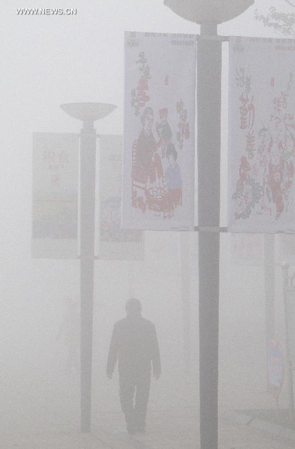 A man walks at a smog-shrouded square in Tangshan City, north China's Hebei Province, Oct. 25, 2014. (Xinhua/Zheng Yong)