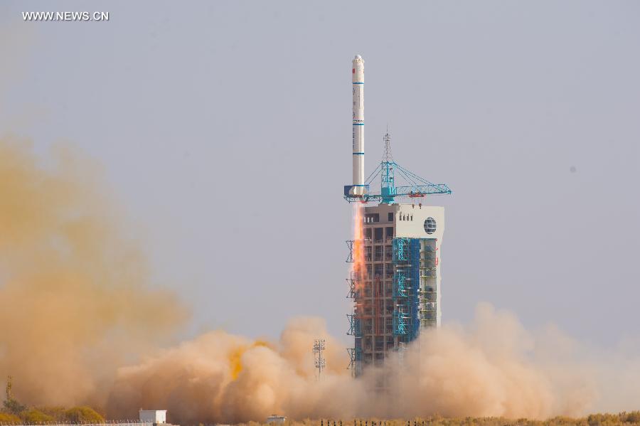 A Long March 2C carrier rocket carrying the Shijian-11-08 experimental satellite leaves the launch pad at the Jiuquan Satellite Launch Center in Jiuquan, northwest China's Gansu Province, Oct. 27, 2014. The Shijian-11-08 satellite, which was launched from Jiuquan at 2:59 p.m. Monday, will be used to conduct scientific experiments in space. The launch marks the 197th flight of the Long March rocket series. (Xinhua/Li Xiang)