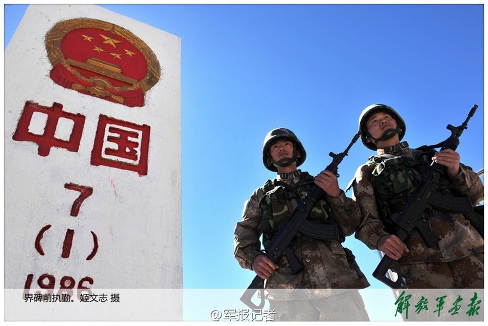 Soldiers are on duty beside a boundary marker. (PLA Pictorial/Ji Wenzhi)