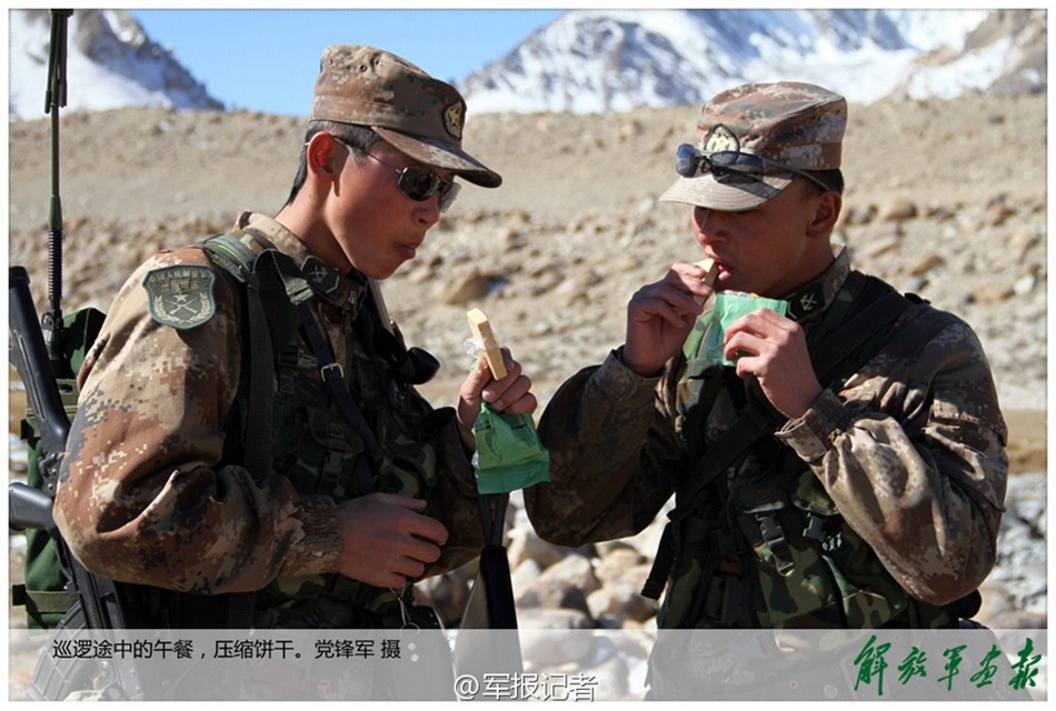 Soldiers eat compressed biscuits for their lunch during the patrol. (PLA Pictorial/Dang Fengjun)