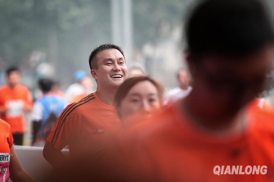 He Yajun finishes the half of the marathon on Oct. 19, 2014. After he passes the middle point, he has a smile on face. (Qianlong/Li He)
