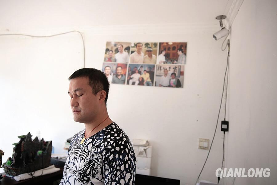 He Yajun is in his own parlor, in front of the pictures he took with celebrities, Oct. 15, 2014. (Qianlong/Li He)