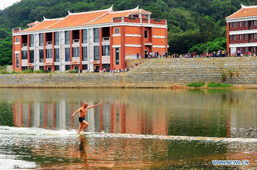 Shi Liliang, a monk from the Quanzhou Shaolin Temple performs Chinese Qinggong by running on water under thin plywood for about 118 meters in Quanzhou City, southeast China's Fujian province on Oct. 26, 2014. (Xinhua News Agency/Wei Peiquan)
