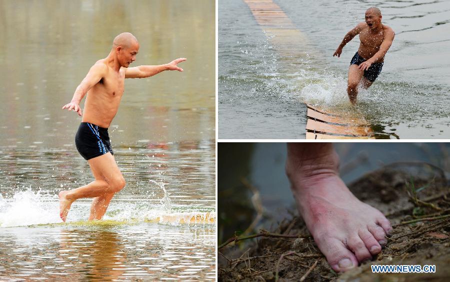 Shi Liliang, a monk from the Quanzhou Shaolin Temple performs Chinese Qinggong by running on water under thin plywood for about 118 meters in Quanzhou City, southeast China's Fujian province on Oct. 26, 2014. (Xinhua News Agency/Wei Peiquan) |