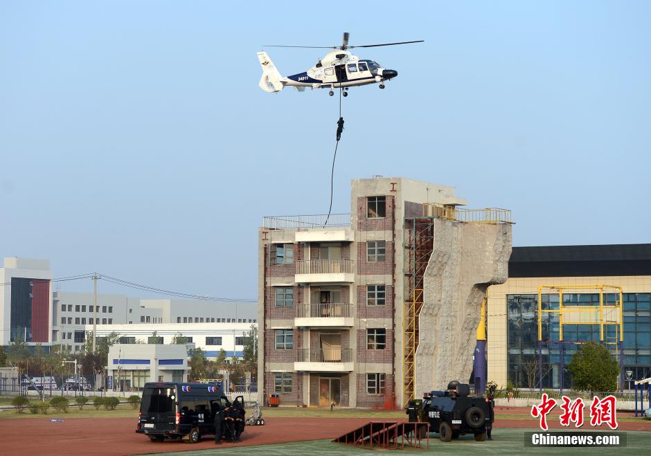 A comprehensive anti-terrorist drill is held in Hefei, central China’s Anhui province on Oct. 26, 2014. Over 600 emergency personnel and 77 emergency vehicles from eight emergency response forces, including special police, armed police, fire department, medical aid, etc., participated in the drill. (Chinanews/Zhang Yazi)
