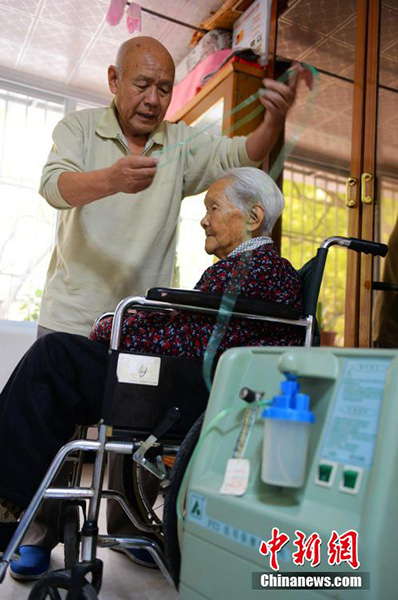 The medical care oxygenator is useful for the 102-year-old lady. (CNS/Hu Qingming)