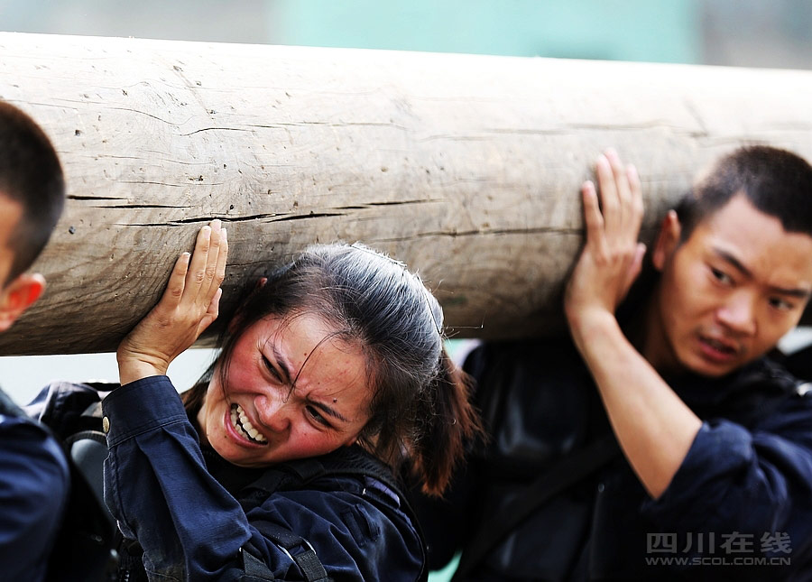 Female armed police officers receive training with their male colleagues in Deyang. (scol.com.cn)