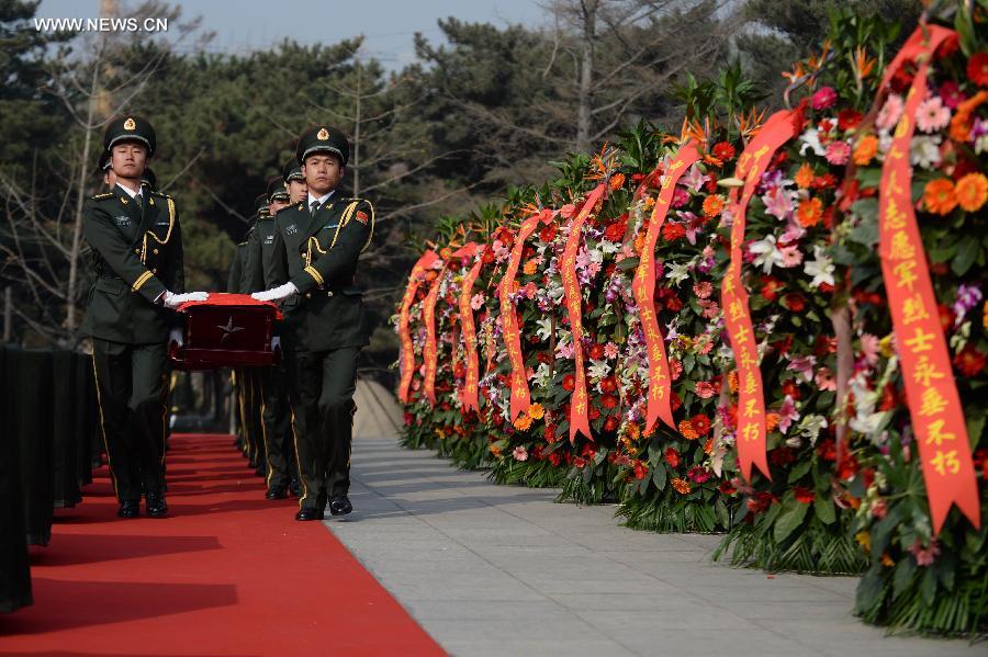Soldiers accompany the remains of Chinese People's Volunteer Army (CPVA) soldiers who died in the Korean War (1950-1953) during a burial ceremony in Shenyang, capital of northeast China's Liaoning Province, Oct. 29, 2014. A burial ceremony for the remains of 437 CPVA soldiers who died in the Korean War was held on Wednesday at a war martyr cemetery in Shenyang. The remains of the 437 war martyrs had been kept in South Korea before they were returned to China last March. (Xinhua/Pan Yulong)