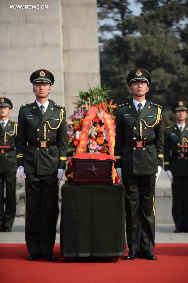 Two soldiers accompany the remains of a Chinese People's Volunteer Army (CPVA) soldier who died in the Korean War (1950-1953) during a burial ceremony in Shenyang, capital of northeast China's Liaoning Province, Oct. 29, 2014. A burial ceremony for the remains of 437 CPVA soldiers who died in the Korean War was held on Wednesday at a war martyr cemetery in Shenyang. The remains of the 437 war martyrs had been kept in South Korea before they were returned to China last March. (Xinhua/Pan Yulong) |