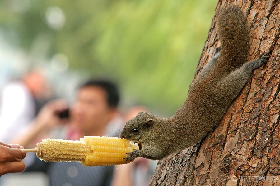 A squirrel in West Lake of Hangzhou enjoys the corn fed by a tourist on Oct. 27, 2014 in east China's Zhejiang province. (Photo/zjol)