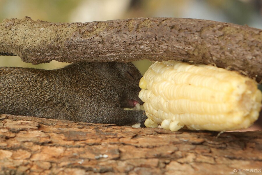 A squirrel in West Lake of Hangzhou enjoys the corn fed by a tourist on Oct. 27, 2014 in east China's Zhejiang province. (Photo/zjol)
