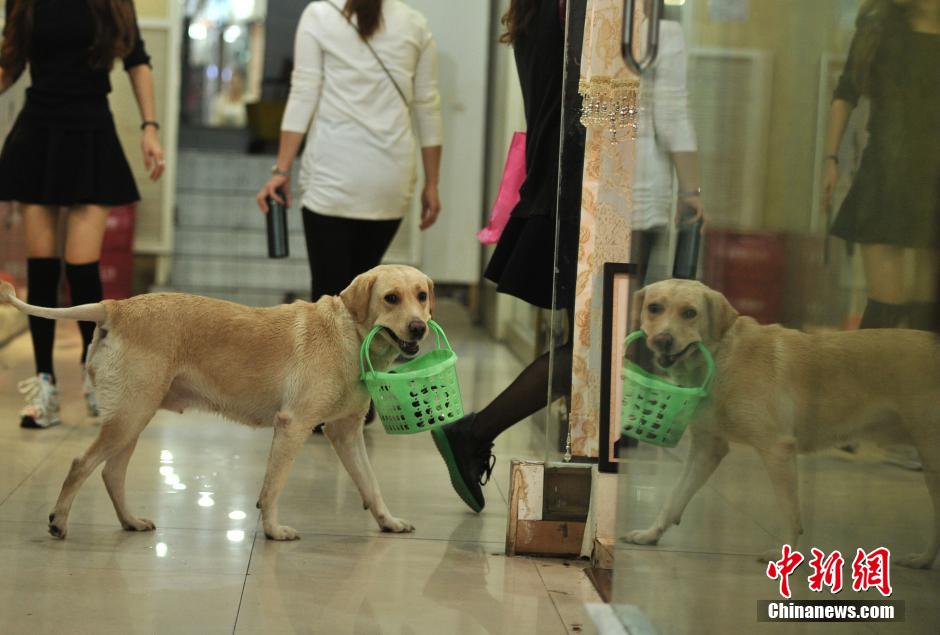 A dog runs behind its owner and carries its owner’s basket in a street of Chongqing on Oct. 29. (Chinanews.com/Chen Chao)