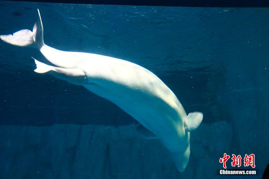 A white whale named "Zhuo Ya" gives birth to a baby in Changsha Aquarium in Changsha, central China's Hunan province on Oct. 29, 2014. The whole process had been recorded by the camera. (CNS/Huang Wei)
