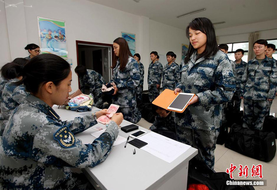 New recruits hand in their electronic devices and other banned items. (China News Agency/Yi Kaihong)