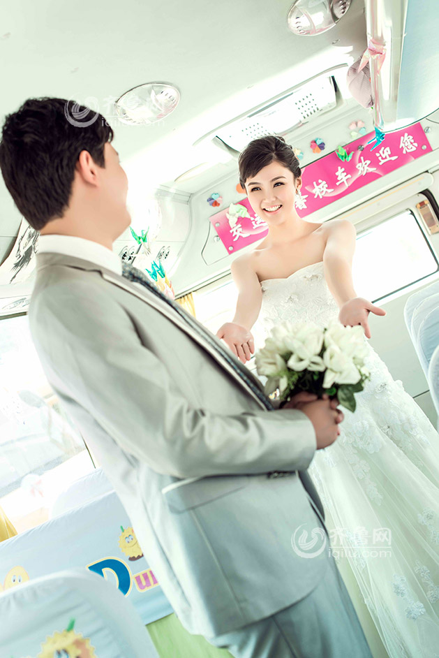 A collection of pre-wedding photos using "big nose" school buses as background has become viral on the Internet recently. The bride Zhang Fan is an employee of the Wenxing School Bus Company of Qingdao Transportation Corporation, whose work is mainly concerned with safety issue of school buses. Zhang says school bus is like another "home" to her, and taking pre-wedding photos in front of them could be her most precious and meaningful memento. (Photo/Iqilu.com)