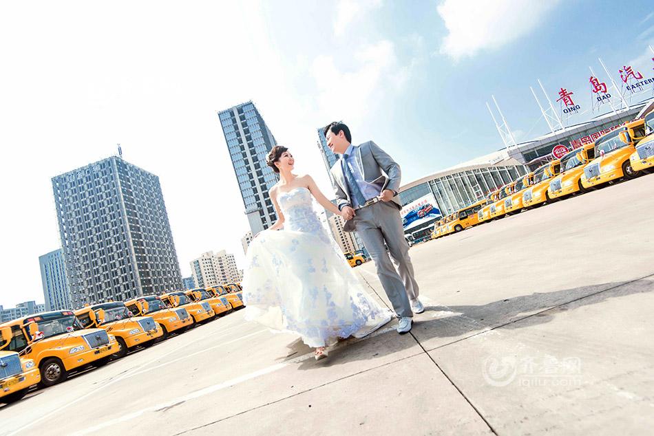 A collection of pre-wedding photos using "big nose" school buses as background has become viral on the Internet recently. The bride Zhang Fan is an employee of the Wenxing School Bus Company of Qingdao Transportation Corporation, whose work is mainly concerned with safety issue of school buses. Zhang says school bus is like another "home" to her, and taking pre-wedding photos in front of them could be her most precious and meaningful memento. (Photo/Iqilu.com)