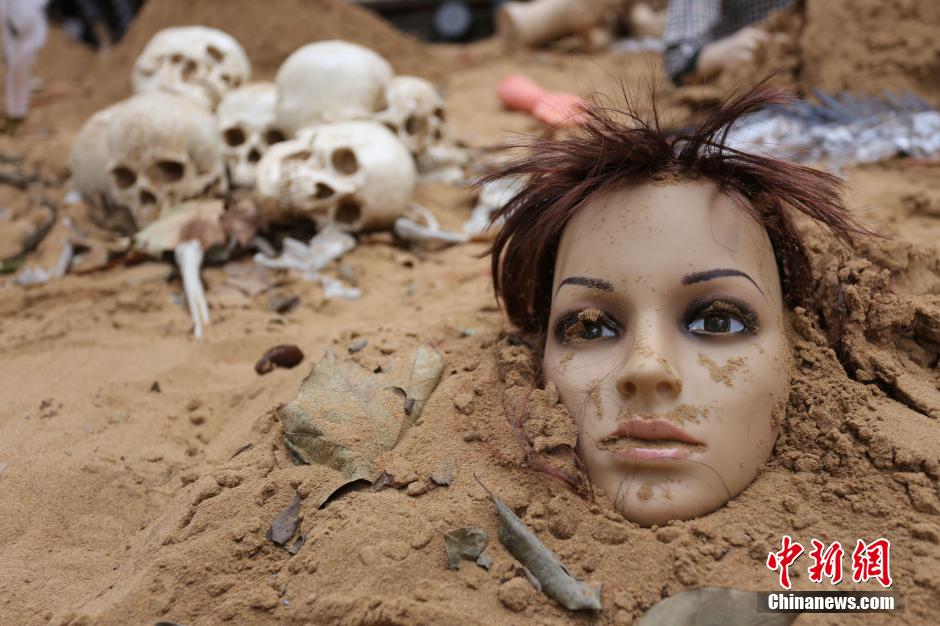 Grave mounds appear in front of a KTV in Zhengzhou, Henan Province. (CNS/Yang Zhenghua)